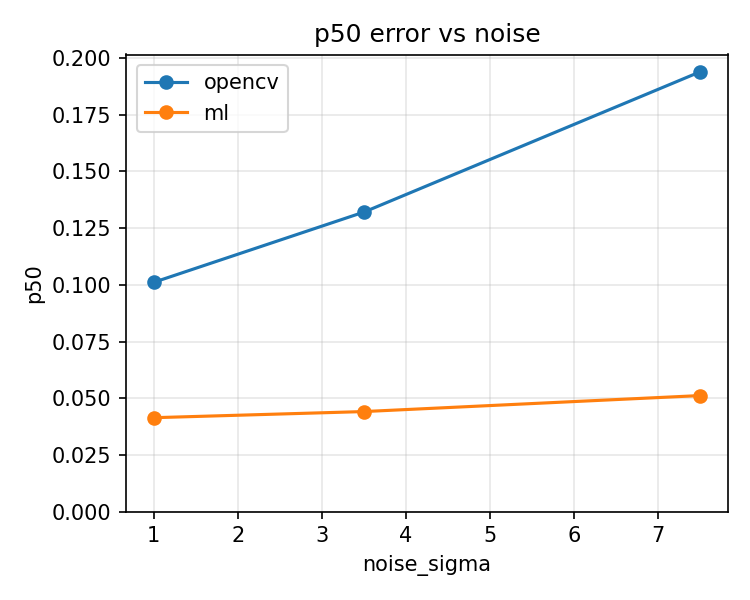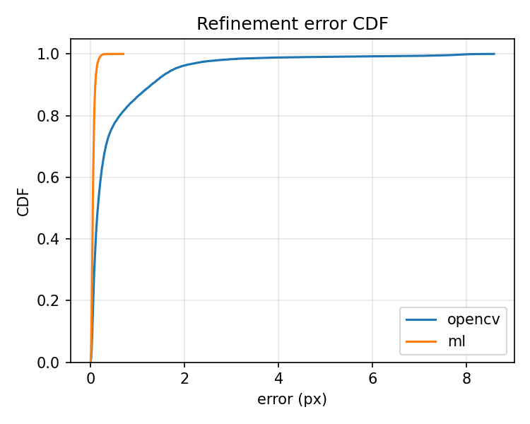 cornerSubPixviatools/ml_refiner/eval/compare_opencv.py, which writes a JSON summary and plots for CDF and error vs noise/blur severity.