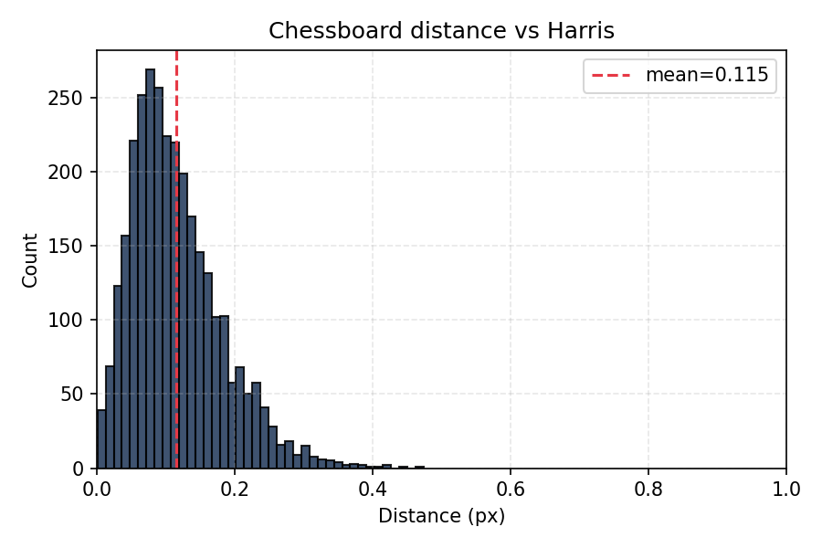 - Harris vs Chessboard: 0.12 pix