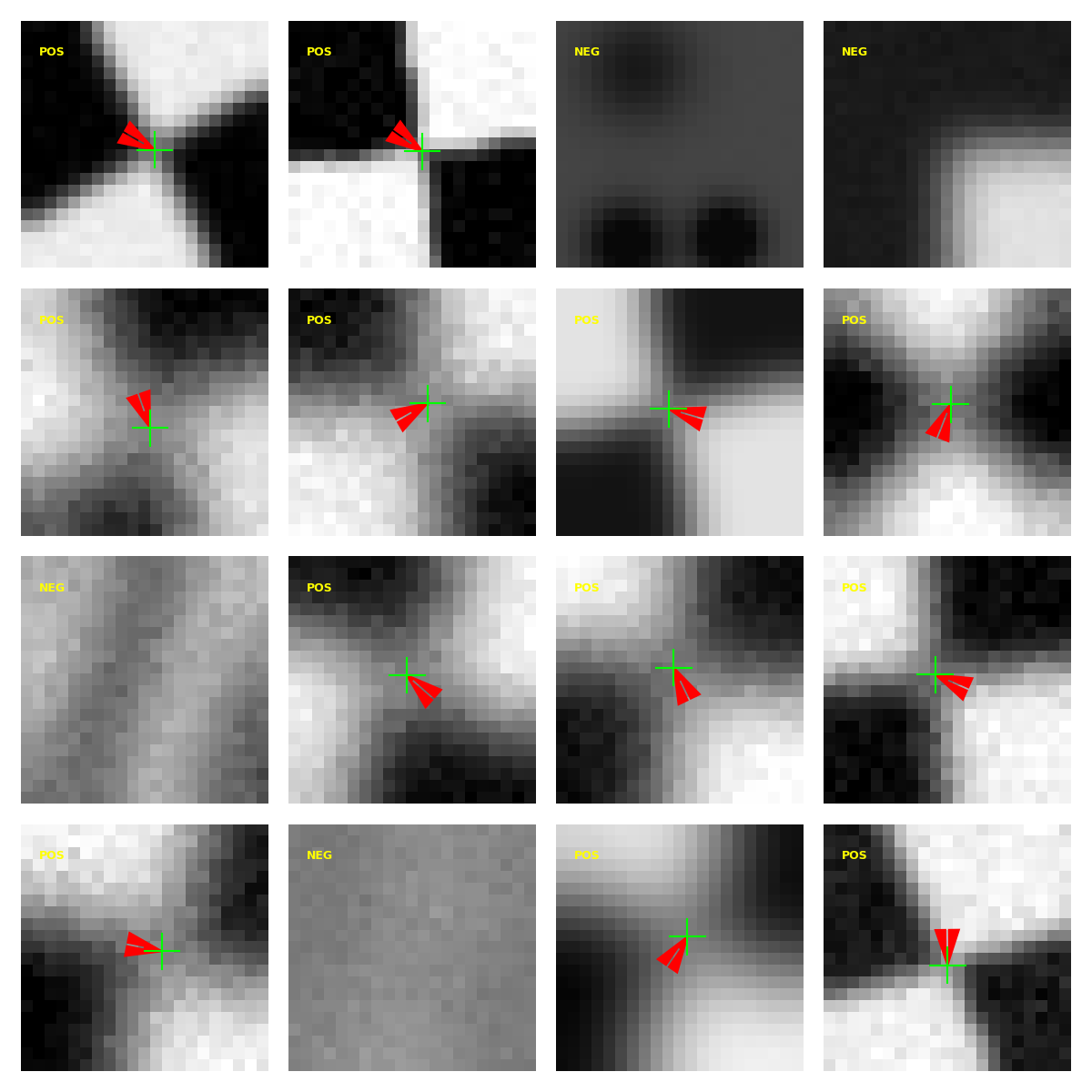 labels each patch with a subpixel offset (dx, dy) and a confidence score